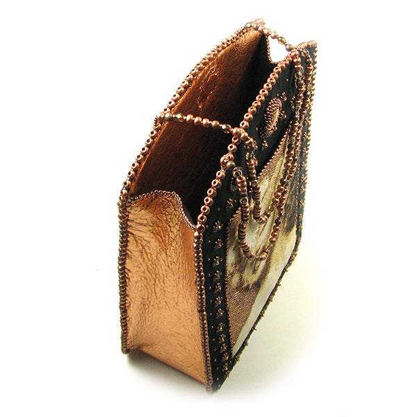 Bombshell Bead Embroidery Purse Instant Download PDF pattern with assembly templates by Ann Benson. This stunning bag is created using a combination of peyote stitch and basic bead embroidery techniques. The front peyote panel, which becomes a pocket, is large enough to accept an iPhone 6. The overall dimensions of the bag are 8" high by 5.5" wide and 2.5" deep at the base. The beaded handle is 10". Once the peyote panel is stitched, it's secure to the front panel with bead embroidery techniques. The decorations are added to the front and back panels. The parts are layered and basted together, then secured with basic edging stitches. Overall, it's a simple purse to make, and wonderfully functional, even for a very dressy occasion. The direction set is thirteen pages, full of detailed graphics, photos, and text to walk you step by step through the creation. The materials list is complete and detailed.