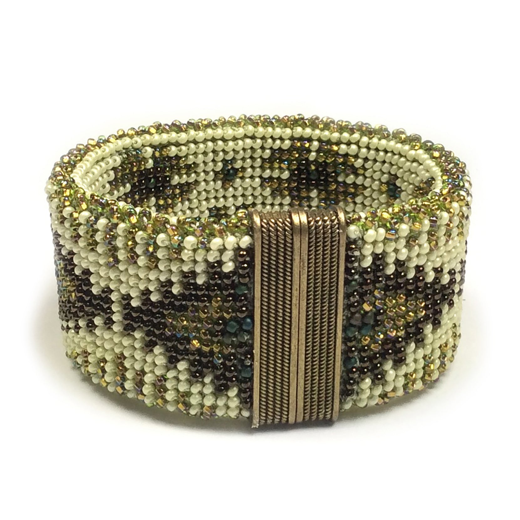 Brass Motifs Reversible Bead Crochet Bracelet Instant Download Pattern by Ann Benson. This design uses only three basic crochet stitches: slip stitch, chain stitch and single crochet. The digital download pattern includes detailed instruction for threading, stitching, finishing and sizing up to 8.5". Magnetic clasps are available in this Etsy shop. Size 11o seed beads are crocheted on light crochet cotton; the resulting reversible strip is glued into the clasp. Couldn't be easier! Directons for basic and beaded crochet are included; link to dedicated free online video included.