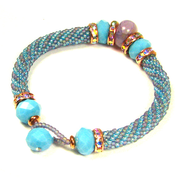 Etherea Bead Crochet Bracelet Kit features two short same-length tubes crocheted in seed beads, decorated with a beautiful array of amethyst, opaque crystals, rhinestone rondelles, and copper spacers. It's a quick one evening project and can be sized to fit almost anyone by shortening or lengthening the two tubes symmetrically. Assembly is easy with the included needles. The kit includes all the beads needed, the stones and rondelles, crochet thread, threading and finishing needles, complete directions for crocheting and assembly. Sizable up to 9".
