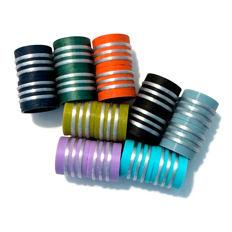 Very strong magnetic clasps, 3D printed with decorative rings. Inside diameter is 10.5mm, overall length assembled 20mm. Excellent for Euro bead crochet, large-round tubular bead crochet and multi-strand projects. Choose from eight different colors with silver decorative rings. Sold in sets of two clasps per color OR in an eight-clasp assortment, one of each color. Strong enough to hold substantial necklaces. Note on shipping: these clasps are very lightweight so shipping one two-set pack costs the same as shipping eight two-set packs or one eight-clasp assortment.
