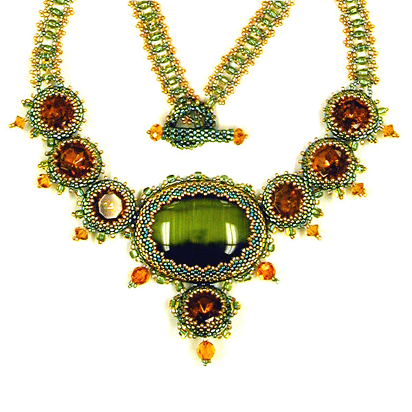 Bezel a focal 40mm x 30mm cabochon, add seven smaller stones in a curved array. Decorate with crystals and seed bead triangles. End the neck chain with a beaded toggle clasp. Highly adjustable to fit nearly anyone; clear graphics, photos, text, with links to free video tutorials.