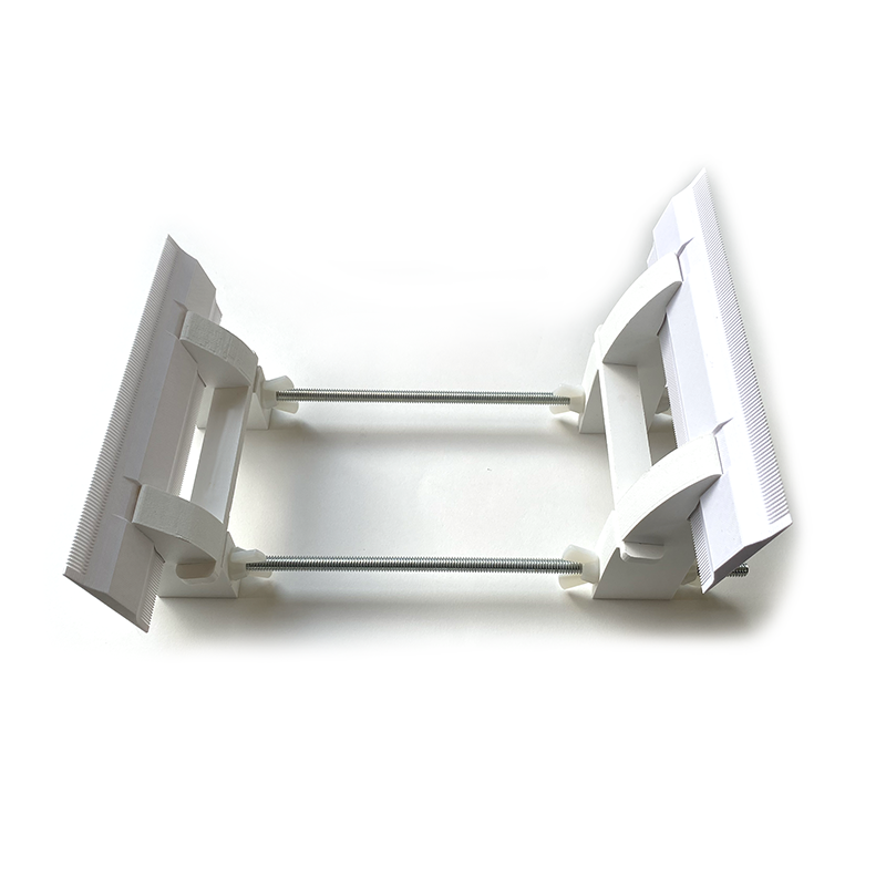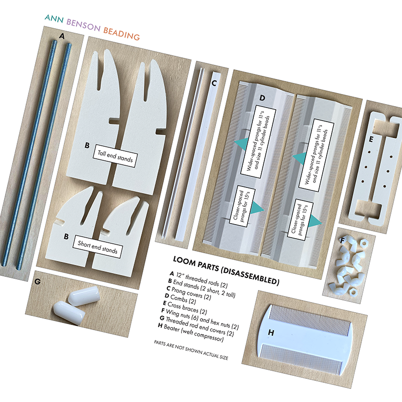This 3D-printed loom makes it possible to complete your looming project without having to weave all the warp ends into the weave. Warp the loom to the desired size and you'll have only two warp thread ends to weave in. Project size can be up to 10.5"" x 6.5" and warp tension can be adjusted. This lightweight table-top loom has one end elevated for ease of weaving. The loom comes with complete assembly directions and guidelines on setting up the warp. The frame is designed and manufactured by Ann Benson in the United States, with only small hardware parts imported.