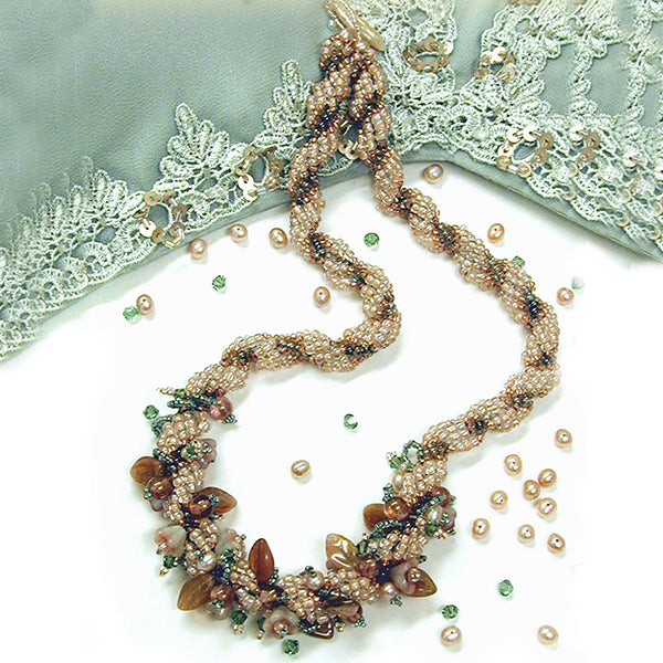 The spiral base is decorated with leaf beads, flower beads, shaped glass beads, pearls, crystals, seed beads. Size is easily adjusted by lengthening or shortening the core spiral. Clear diagrams and photos make this necklace a breeze to create.