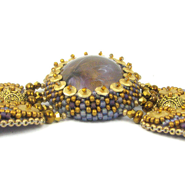 Very simple, but so striking, and truly easy to create in simple bead embroidery stitches and peyote stitch. The center stone is a vintage acryilic high-domed cabochon in shades of dusty lavender, with bronze striations. The seed beads complement those colors, as do the additional decorations. The complete kit includes the vintage acrylic center stone, 10mm brass bead caps, Czech and Japanese seed beads in sizes 11o, 6o, and 15o, sequins in matte gold in three sizes, bicone crystals, needles, thread, complete directions for stitching and sizing. Also included are design in full color printed on nonwoven stitching base, Ultrasuede backing, needles, and nylon beading thread. This necklace can easily be adjusted in size to fit almost anyone because of the "buttonhole strand" construction.